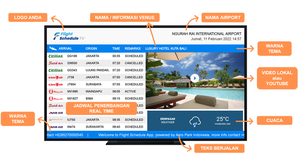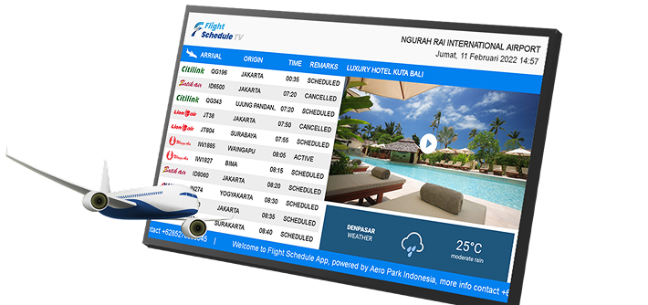 Flight Schedule TV adalah layar informasi digital yang menampilkan jadwal penerbangan langsung (real-time) dari bandara seluruh dunia di TV.